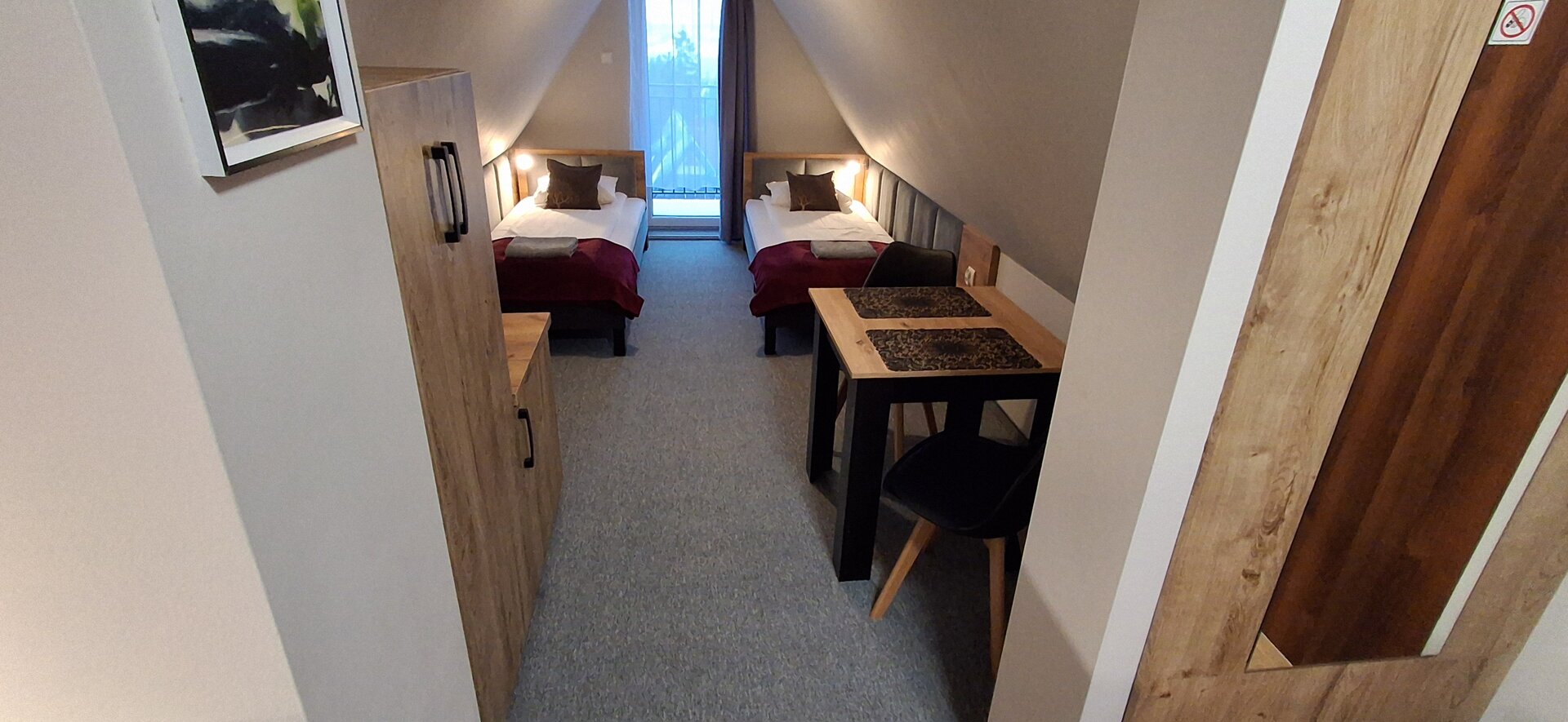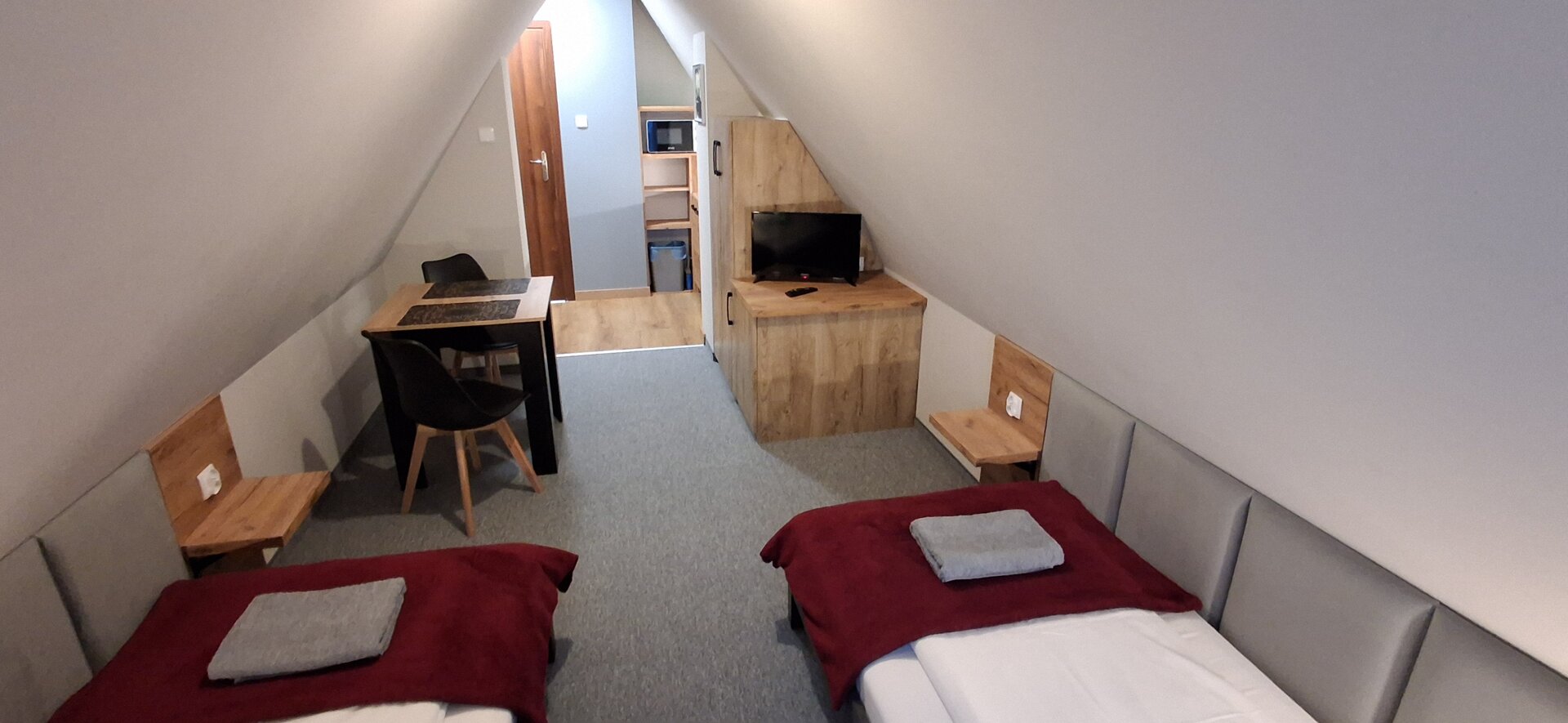 Pokój dwuosobowy TWIN z dwoma łóżkami pojedynczymi (z możliwością złączenia), prywatną łazienką oraz mini aneksem (lodówka, mikrofalówka, czajnik – bez zlewu i płyty grzejnej). Pokój nie posiada balkonu. TV, bezpłatne Wi-Fi.