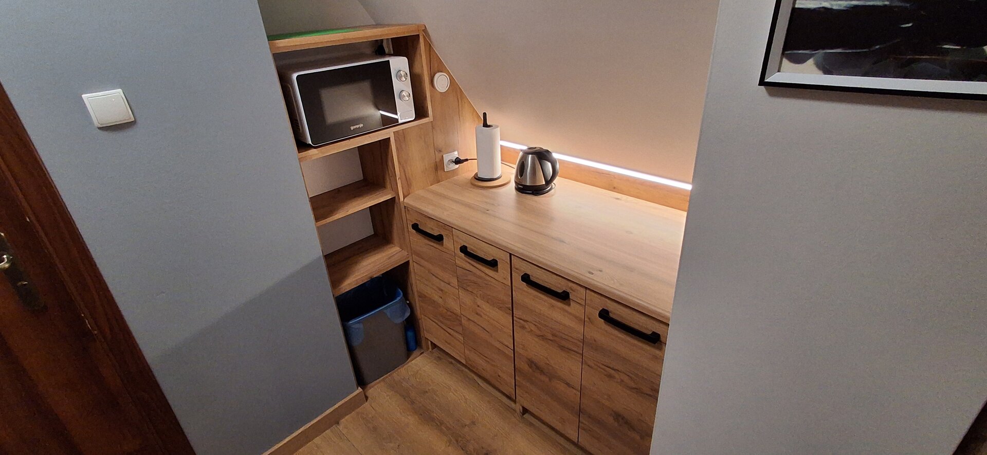 Do dyspozycji Gości jest mini aneks kuchenny, który wyposażony jest w lodówkę, kuchenkę mikrofalową, czajnik oraz komplet talerzyków, kubków i sztućców. Aneks nie posiada zlewu i płyty grzejnej, co pozwala zachować kompaktową i estetyczną formę przestrzeni.