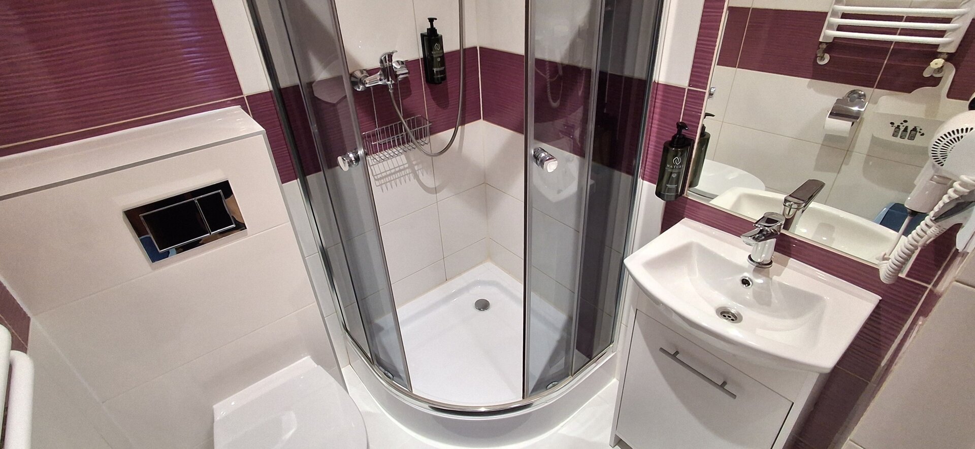 Prywatna łazienka obejmuje prysznic, umywalkę i toaletę. Dla wygody Gości zapewniamy ręczniki, suszarkę do włosów oraz podstawowe kosmetyki.